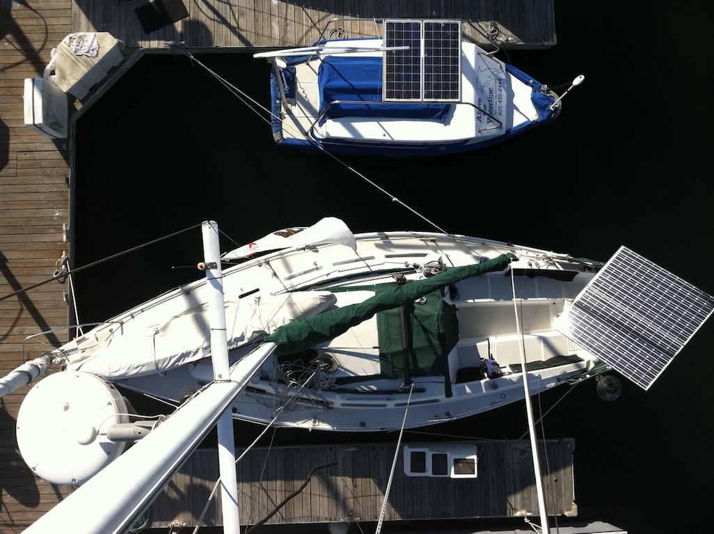 The Solar Array on Kapowai changes angle and bearing by electric actuator on a joystick. This array has an output of 420 watts and can focus anywhere in the sky for maximum output all day long. Mobile Solar Arrays can be made to track the sun, however it is quite expensive. An Array should therefore be treated like a sail, and moved by hand as necessary. The top of pole mount electric actuator is very powerful and reliable, having been in operation flawlessly for a decade. The rotation of the pole is best done manually with a pull down handle and pole brake mount.